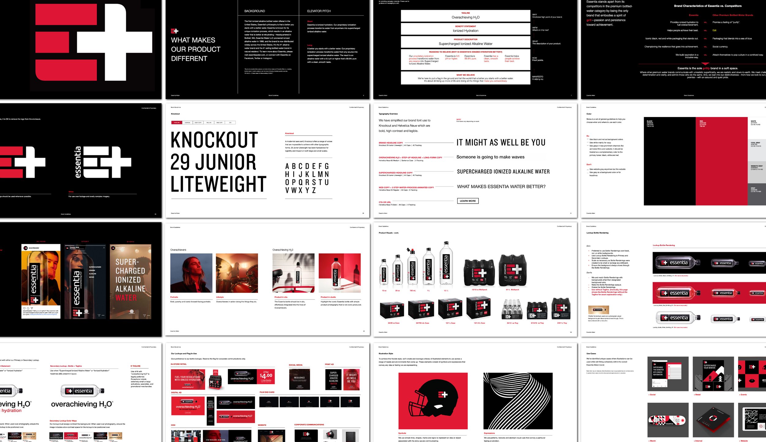 Brand Guidelines❋ Logo & Package DesignI contributed to the evolution of Essentia’s iconic E+ logo and the extension of the refreshed identity across the full packaging suite, including single bottles, multi-packs and retail shippers. Breaking away from category clichés of blue colors and water droplet graphics, we created a bold, high-contrast system that reinforced Essentia’s “Overachieving H2O” positioning and made it unmistakable on shelf.